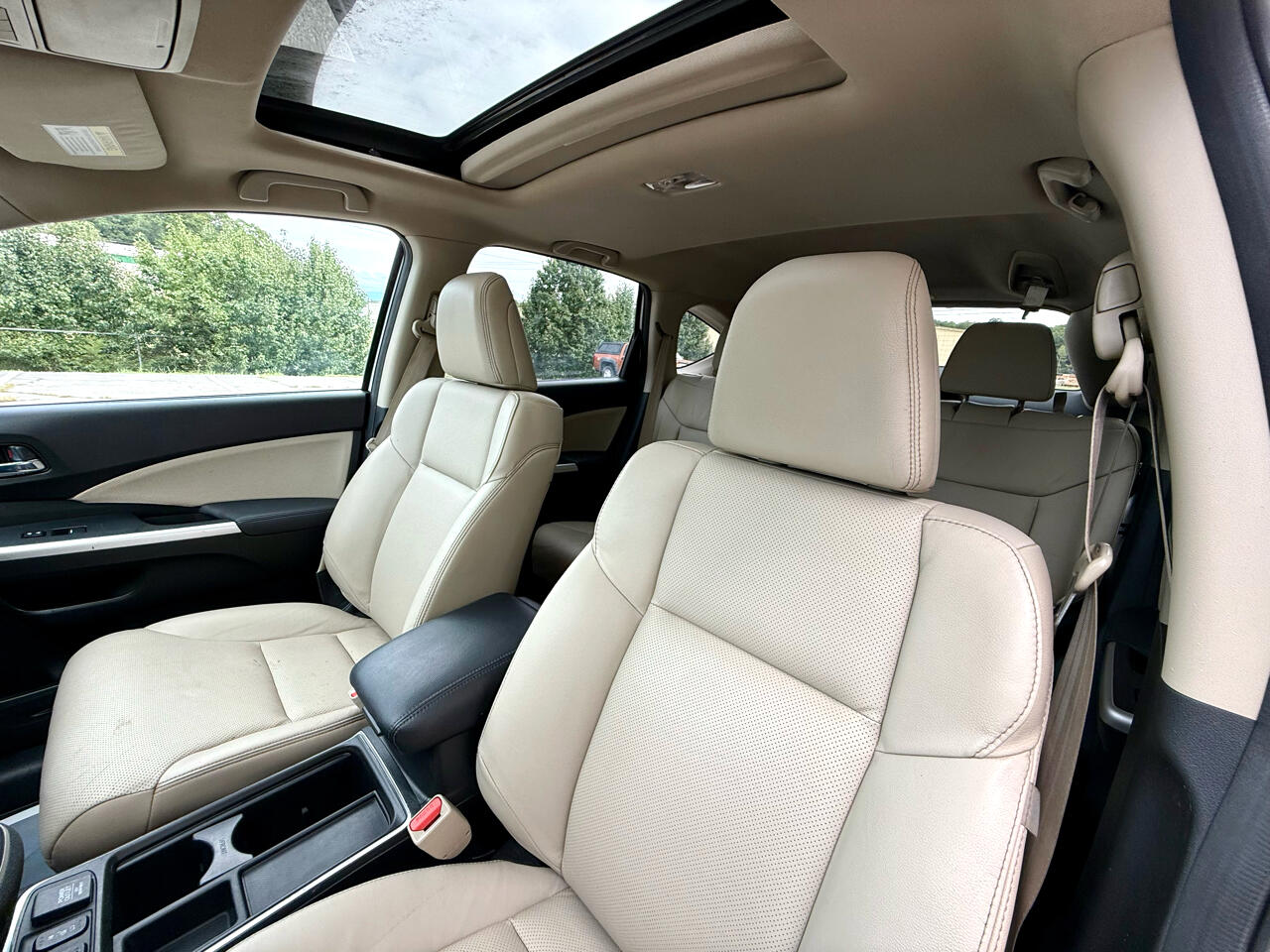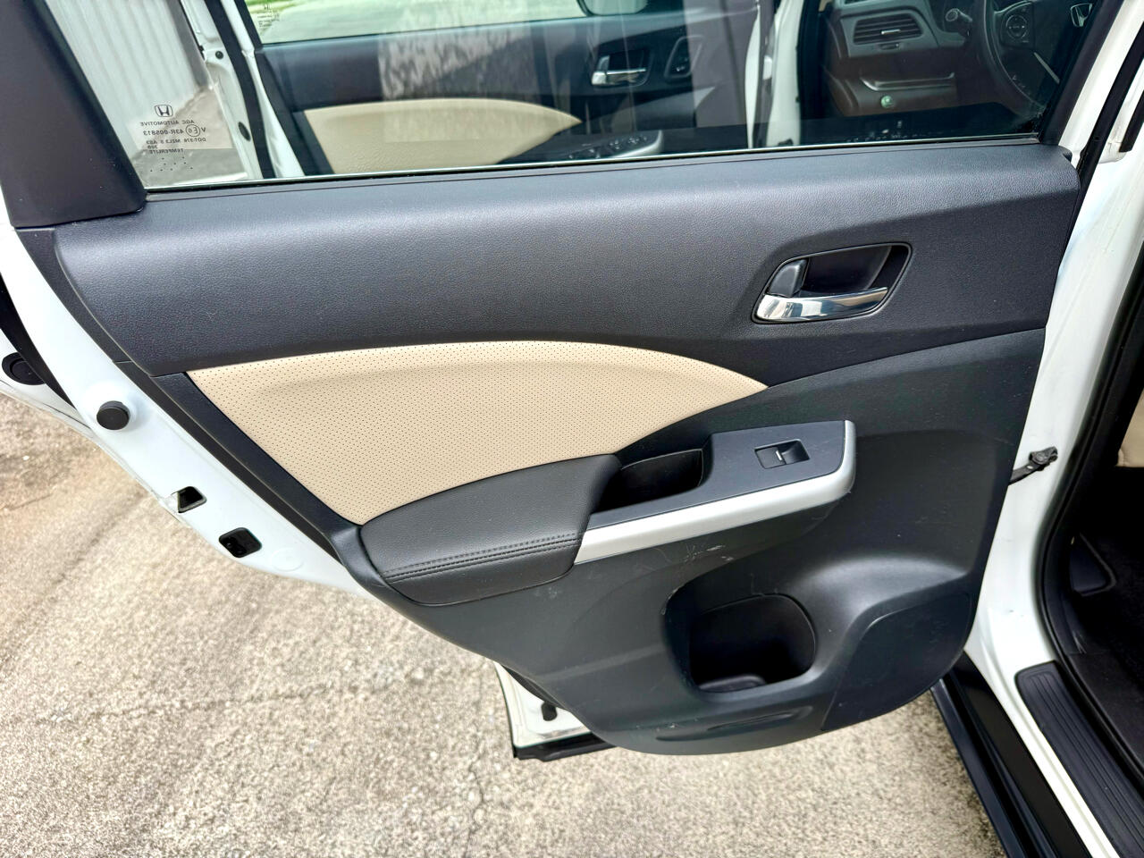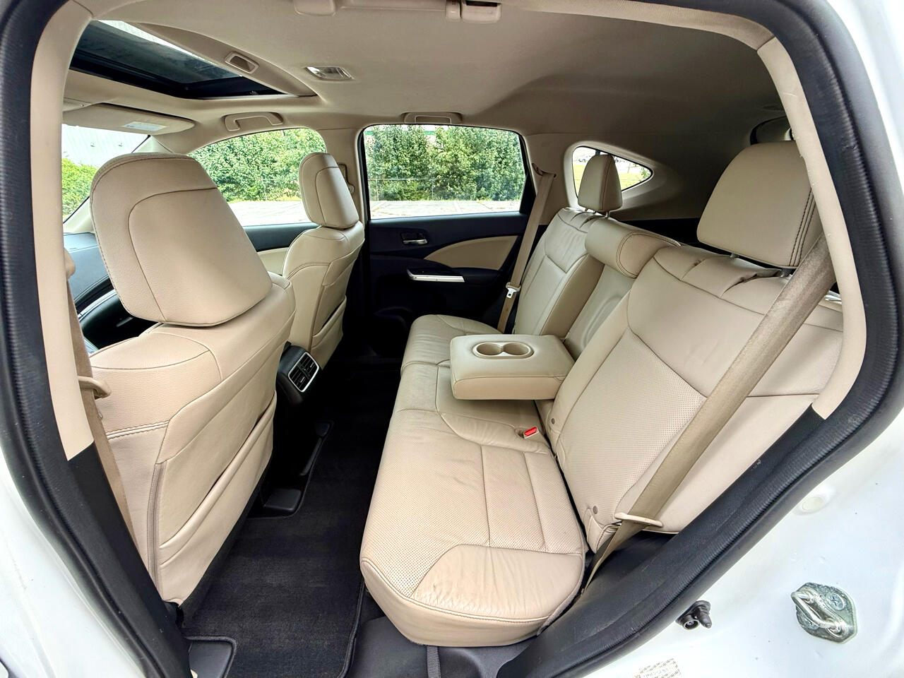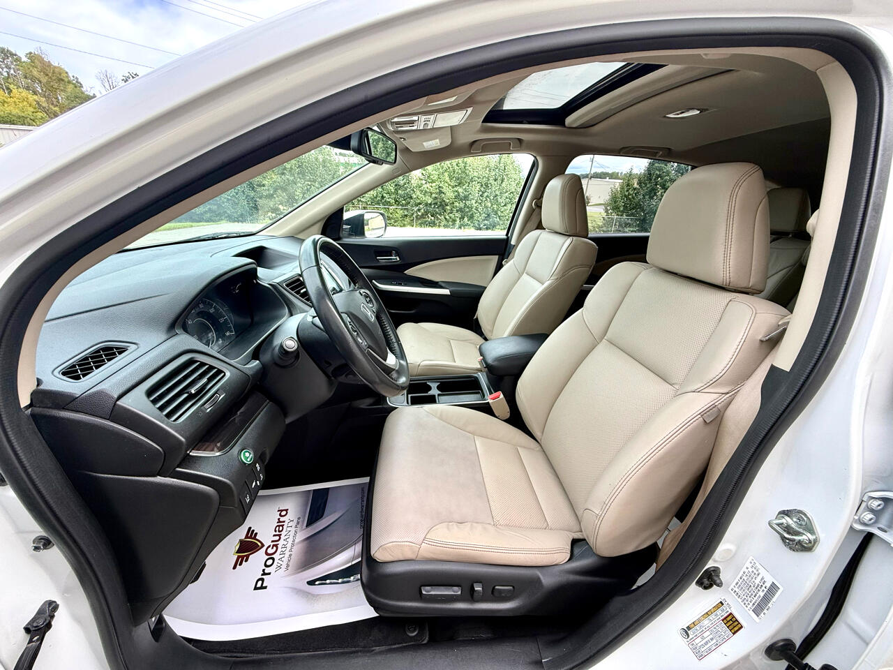 CR-V Touring, 4D Sport Utility, 2.4L I4 DOHC 16V i-VTEC, CVT, FWD, White Diamond Pearl, Beige w/Leather Seat Trim, 18" Alloy Wheels, 4-Wheel Disc Brakes, 5.048 Axle Ratio, 7 Speakers, ABS brakes, Air Conditioning, Alloy wheels, AM/FM radio: SiriusXM, Auto-dimming Rear-View mirror, Automatic temperature control, Brake assist, Bumpers: body-color, CD player, Compass, Delay-off headlights, Driver door bin, Driver vanity mirror, Dual front impact airbags, Dual front side impact airbags, Electronic Stability Control, Exterior Parking Camera Rear, Four wheel independent suspension, Front anti-roll bar, Front Bucket Seats, Front Center Armrest, Front dual zone A/C, Front fog lights, Front reading lights, Garage door transmitter: HomeLink, Heated door mirrors, Heated Front Bucket Seats, Heated front seats, Illuminated entry, Lane Departure Warning System, Leather Seat Trim, Leather Shift Knob, Low tire pressure warning, Memory seat, Navigation System, Occupant sensing airbag, Outside temperature display, Overhead airbag, Overhead console, Panic alarm, Passenger door bin, Passenger vanity mirror, Power door mirrors, Power driver seat, Power Liftgate, Power moonroof, Power steering, Power windows, Radio data system, Radio: AM/FM/CD/HD/SiriusXM Audio System, Rear anti-roll bar, Rear seat center armrest, Rear window defroster, Rear window wiper, Remote keyless entry, Roof rack: rails only, Security system, Speed control, Speed-sensing steering, Speed-Sensitive Wipers, Split folding rear seat, Steering wheel mounted audio controls, Tachometer, Telescoping steering wheel, Tilt steering wheel, Traction control, Trip computer, Turn signal indicator mirrors, Variably intermittent wipers, CR-V Touring, 4D Sport Utility, 2.4L I4 DOHC 16V i-VTEC, CVT, FWD, White Diamond Pearl, Beige w/Leather Seat Trim.