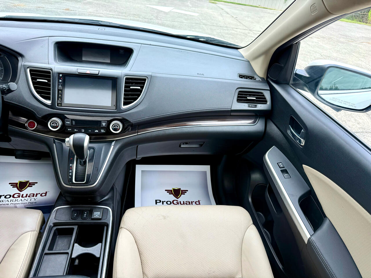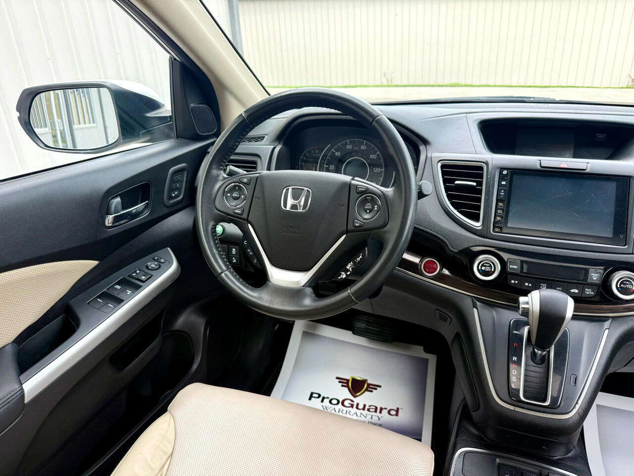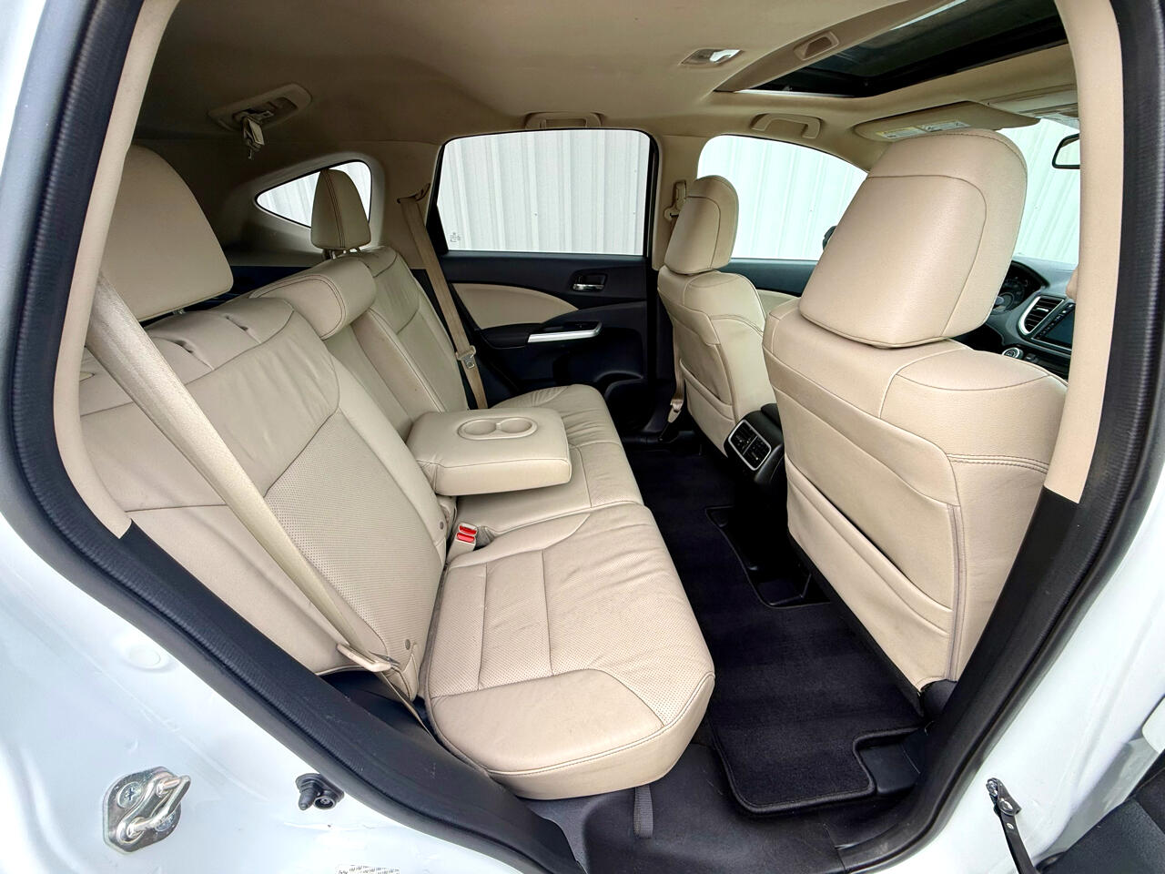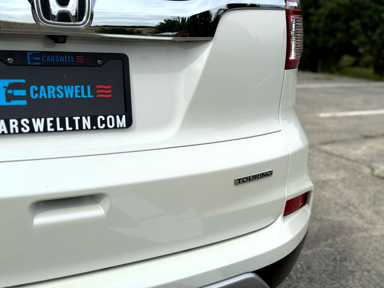 CR-V Touring, 4D Sport Utility, 2.4L I4 DOHC 16V i-VTEC, CVT, FWD, White Diamond Pearl, Beige w/Leather Seat Trim, 18" Alloy Wheels, 4-Wheel Disc Brakes, 5.048 Axle Ratio, 7 Speakers, ABS brakes, Air Conditioning, Alloy wheels, AM/FM radio: SiriusXM, Auto-dimming Rear-View mirror, Automatic temperature control, Brake assist, Bumpers: body-color, CD player, Compass, Delay-off headlights, Driver door bin, Driver vanity mirror, Dual front impact airbags, Dual front side impact airbags, Electronic Stability Control, Exterior Parking Camera Rear, Four wheel independent suspension, Front anti-roll bar, Front Bucket Seats, Front Center Armrest, Front dual zone A/C, Front fog lights, Front reading lights, Garage door transmitter: HomeLink, Heated door mirrors, Heated Front Bucket Seats, Heated front seats, Illuminated entry, Lane Departure Warning System, Leather Seat Trim, Leather Shift Knob, Low tire pressure warning, Memory seat, Navigation System, Occupant sensing airbag, Outside temperature display, Overhead airbag, Overhead console, Panic alarm, Passenger door bin, Passenger vanity mirror, Power door mirrors, Power driver seat, Power Liftgate, Power moonroof, Power steering, Power windows, Radio data system, Radio: AM/FM/CD/HD/SiriusXM Audio System, Rear anti-roll bar, Rear seat center armrest, Rear window defroster, Rear window wiper, Remote keyless entry, Roof rack: rails only, Security system, Speed control, Speed-sensing steering, Speed-Sensitive Wipers, Split folding rear seat, Steering wheel mounted audio controls, Tachometer, Telescoping steering wheel, Tilt steering wheel, Traction control, Trip computer, Turn signal indicator mirrors, Variably intermittent wipers, CR-V Touring, 4D Sport Utility, 2.4L I4 DOHC 16V i-VTEC, CVT, FWD, White Diamond Pearl, Beige w/Leather Seat Trim.