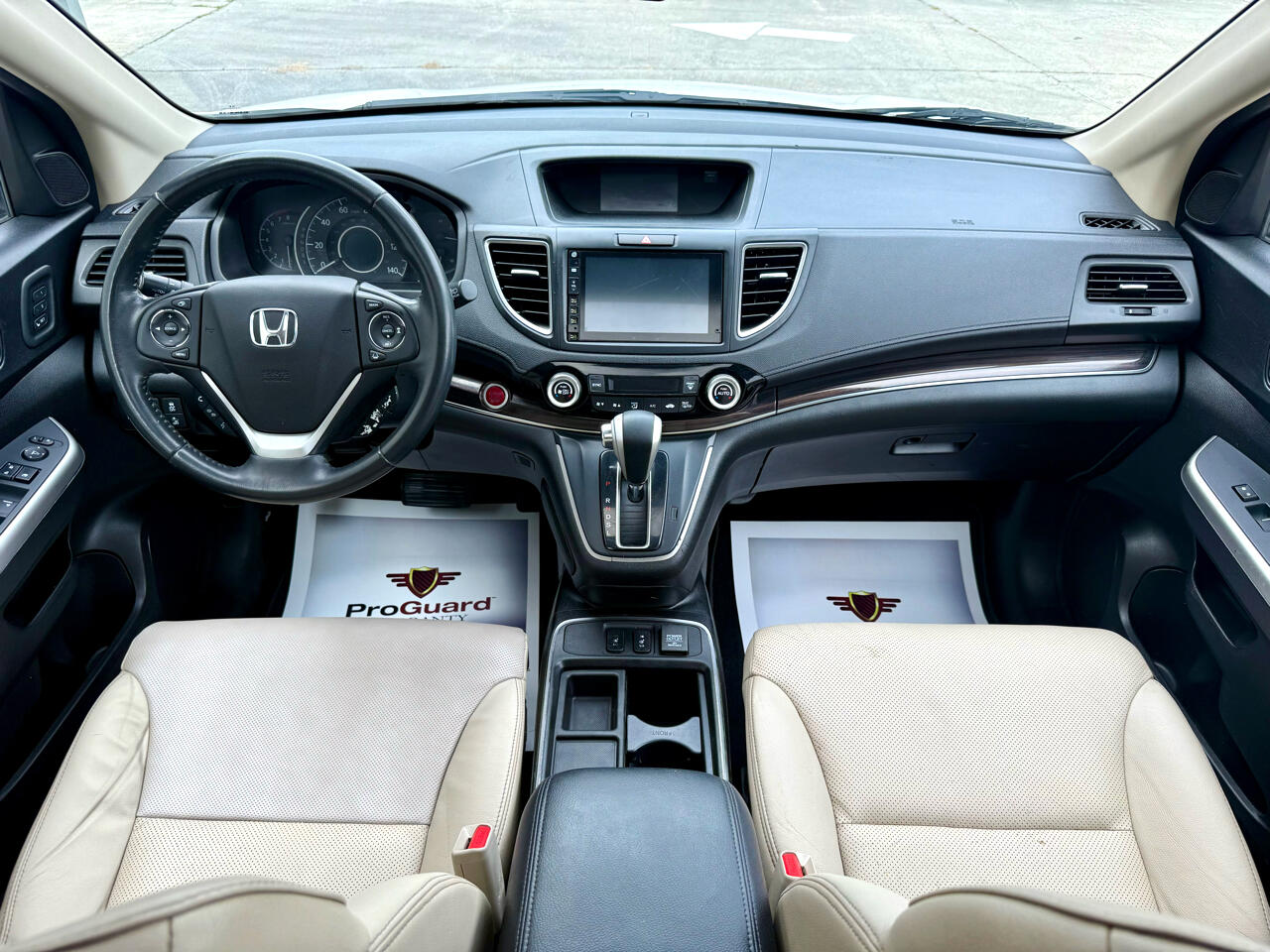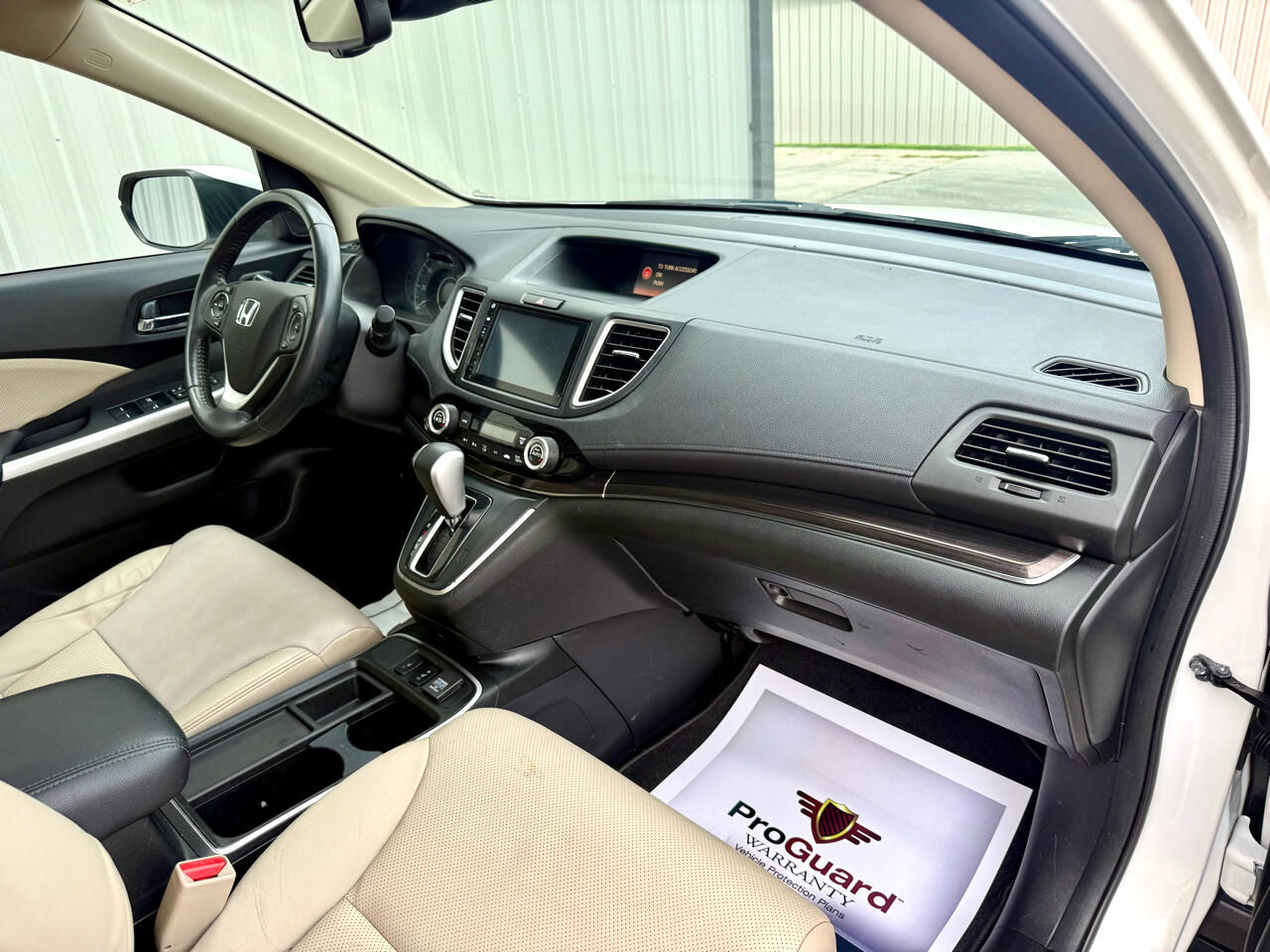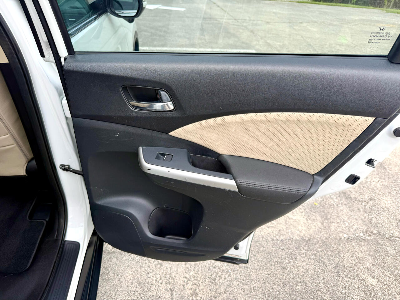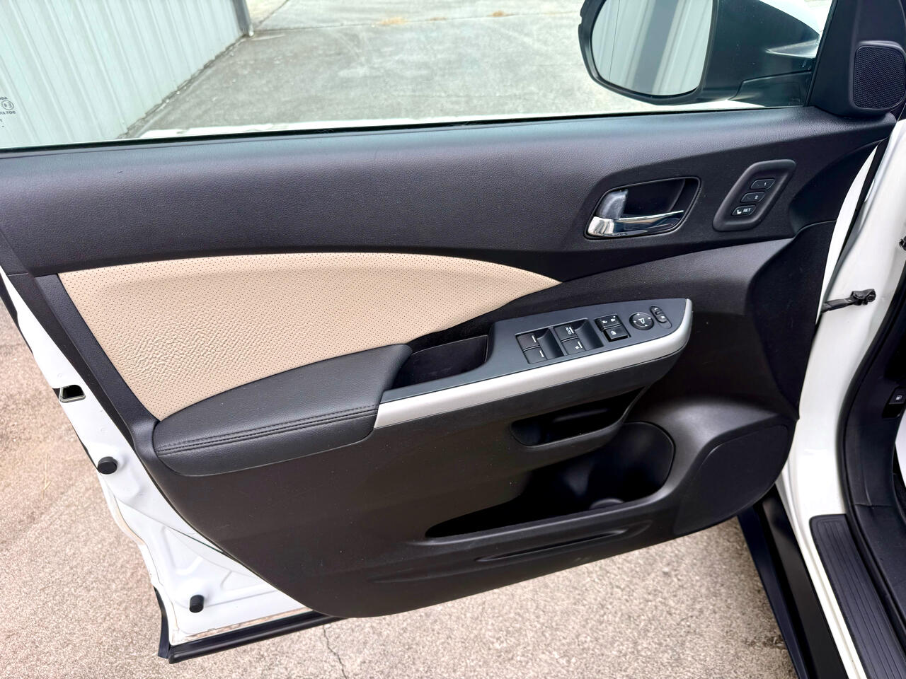 CR-V Touring, 4D Sport Utility, 2.4L I4 DOHC 16V i-VTEC, CVT, FWD, White Diamond Pearl, Beige w/Leather Seat Trim, 18" Alloy Wheels, 4-Wheel Disc Brakes, 5.048 Axle Ratio, 7 Speakers, ABS brakes, Air Conditioning, Alloy wheels, AM/FM radio: SiriusXM, Auto-dimming Rear-View mirror, Automatic temperature control, Brake assist, Bumpers: body-color, CD player, Compass, Delay-off headlights, Driver door bin, Driver vanity mirror, Dual front impact airbags, Dual front side impact airbags, Electronic Stability Control, Exterior Parking Camera Rear, Four wheel independent suspension, Front anti-roll bar, Front Bucket Seats, Front Center Armrest, Front dual zone A/C, Front fog lights, Front reading lights, Garage door transmitter: HomeLink, Heated door mirrors, Heated Front Bucket Seats, Heated front seats, Illuminated entry, Lane Departure Warning System, Leather Seat Trim, Leather Shift Knob, Low tire pressure warning, Memory seat, Navigation System, Occupant sensing airbag, Outside temperature display, Overhead airbag, Overhead console, Panic alarm, Passenger door bin, Passenger vanity mirror, Power door mirrors, Power driver seat, Power Liftgate, Power moonroof, Power steering, Power windows, Radio data system, Radio: AM/FM/CD/HD/SiriusXM Audio System, Rear anti-roll bar, Rear seat center armrest, Rear window defroster, Rear window wiper, Remote keyless entry, Roof rack: rails only, Security system, Speed control, Speed-sensing steering, Speed-Sensitive Wipers, Split folding rear seat, Steering wheel mounted audio controls, Tachometer, Telescoping steering wheel, Tilt steering wheel, Traction control, Trip computer, Turn signal indicator mirrors, Variably intermittent wipers, CR-V Touring, 4D Sport Utility, 2.4L I4 DOHC 16V i-VTEC, CVT, FWD, White Diamond Pearl, Beige w/Leather Seat Trim.