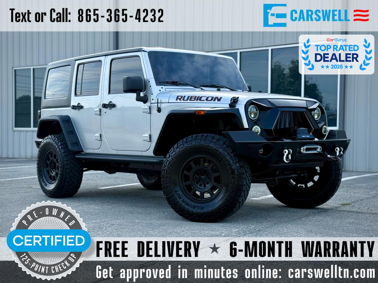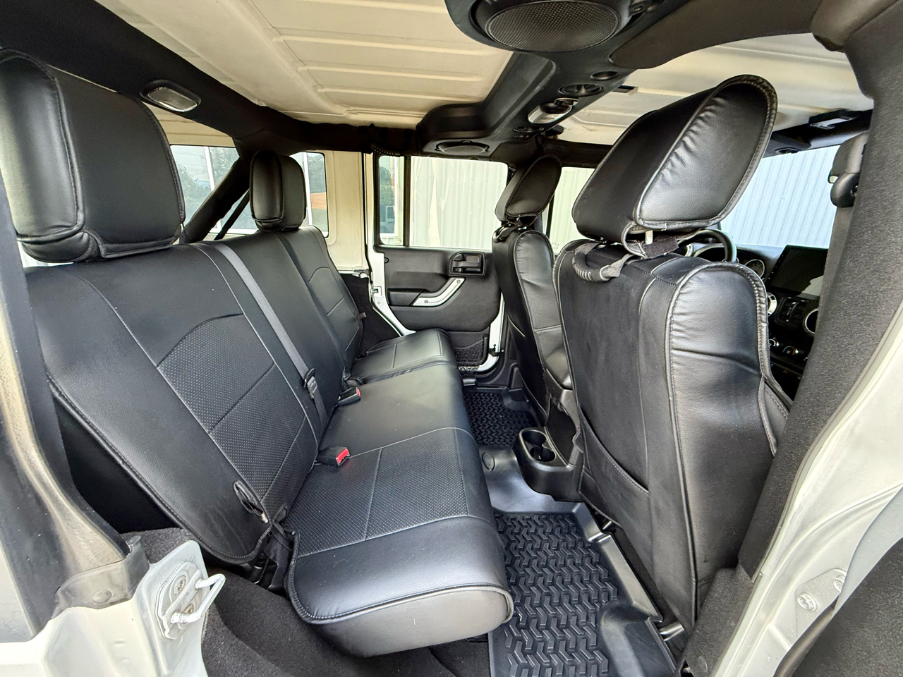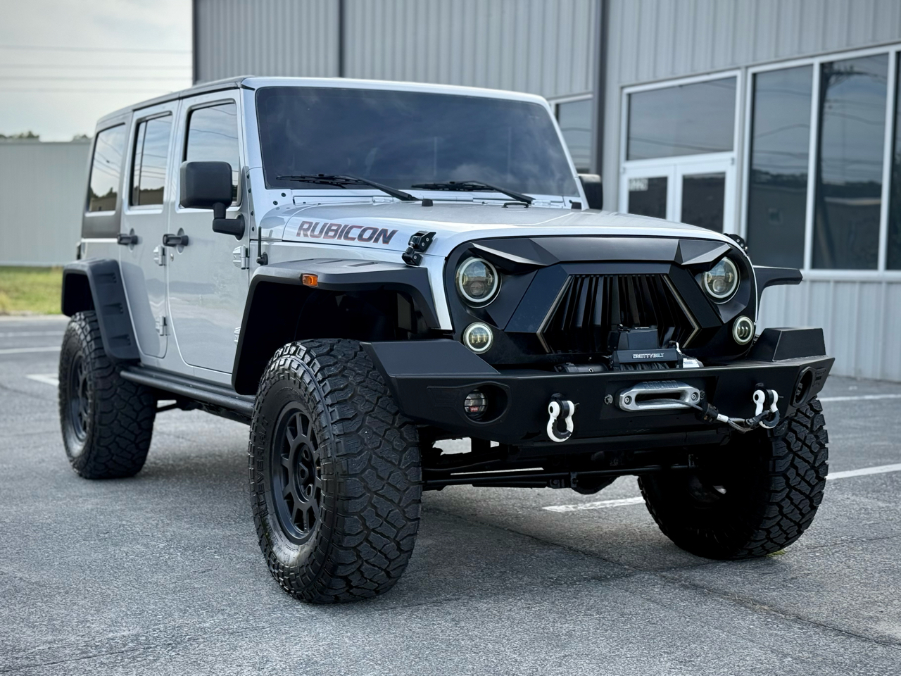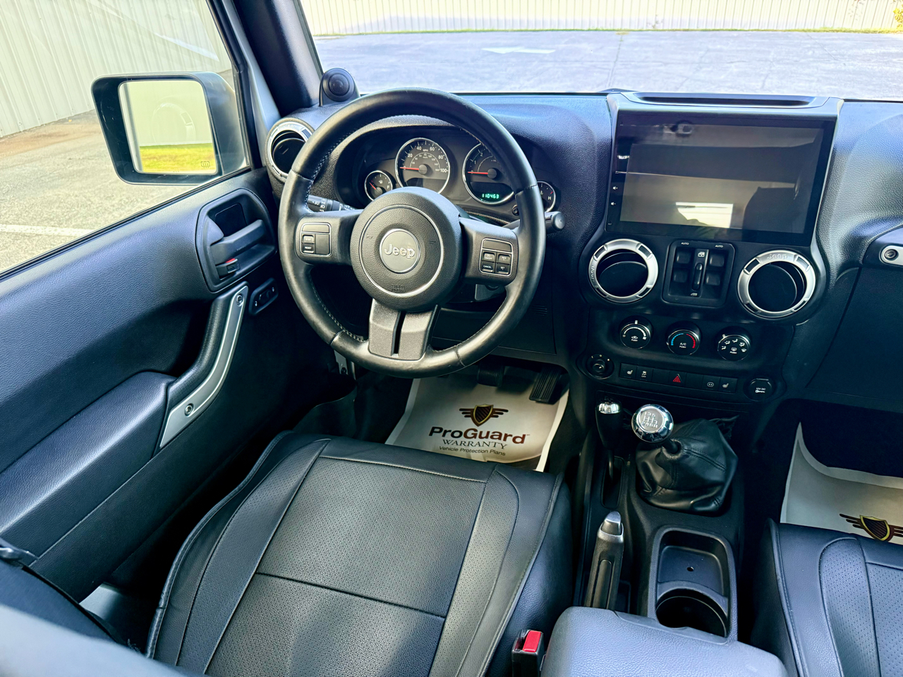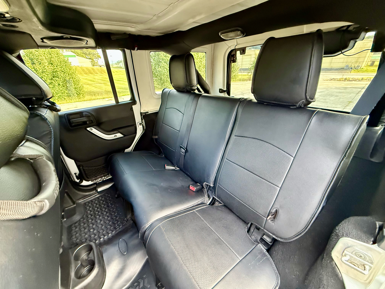 Wrangler Unlimited Rubicon, 4D Sport Utility, 3.6L V6 24V VVT, 6-Speed Manual, 4WD, Bright Silver Metallic Clearcoat, Black w/Cloth Bucket Seats, 17" x 7.5" Painted Aluminum Wheels, 4-Wheel Disc Brakes, 4.10 Rear Axle Ratio, 7 Speakers, ABS brakes, Air Conditioning, Alloy wheels, AM/FM radio: SIRIUS, Audio Jack Input for Mobile Devices, Black 3-Piece Hard Top, Brake assist, CD player, Class II Receiver Hitch, Cloth Bucket Seats, Compass, Driver door bin, Driver vanity mirror, Dual front impact airbags, Electronic Stability Control, Freedom Panel Storage Bag, Front anti-roll bar, Front Bucket Seats, Front Center Armrest w/Storage, Front fog lights, Fully automatic headlights, Heated door mirrors, Heated Front Seats, Illuminated entry, Integrated roll-over protection, Leather steering wheel, Low tire pressure warning, Max Tow Package, Occupant sensing airbag, Outside temperature display, Panic alarm, Passenger door bin, Passenger vanity mirror, Performance Suspension, Power door mirrors, Power steering, Power windows, Quick Order Package 23R, Radio data system, Radio: Uconnect 130 CD/MP3, Rear anti-roll bar, Rear Window Defroster, Rear Window Wiper/Washer, Remote keyless entry, Security system, Speed control, Split folding rear seat, Steering wheel mounted audio controls, Tachometer, Tilt steering wheel, Traction control, Trailer Sway Damping, Trailer Tow w/4-Pin Connector Wiring, Trip computer, Variably intermittent wipers, Wrangler Unlimited Rubicon, 4D Sport Utility, 3.6L V6 24V VVT, 6-Speed Manual, 4WD, Bright Silver Metallic Clearcoat, Black w/Cloth Bucket Seats.