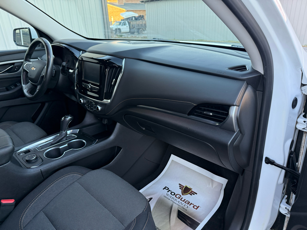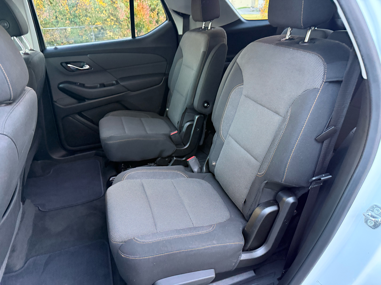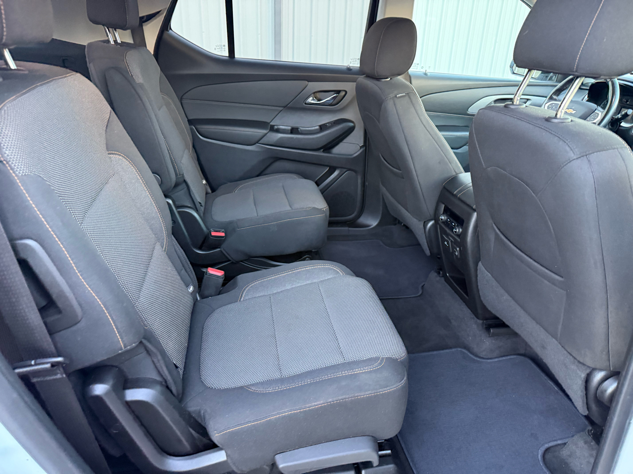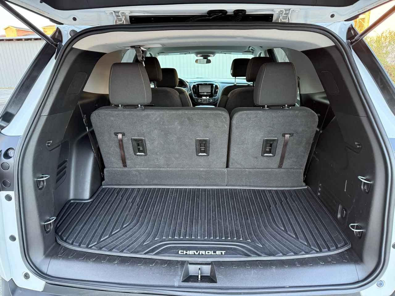 Traverse LT Cloth w/2FL, 4D Sport Utility, 3.6L V6 SIDI VVT, 9-Speed Automatic, AWD, Summit White, Jet Black w/Premium Cloth Seat Trim, 1st & 2nd Row All-Weather Floor Mats, 3.49 Axle Ratio, 3rd Row All-Weather Floor Mats, 3rd row seats: split-bench, 4-Wheel Disc Brakes, 6 Speakers, 7-Passenger Seating (2-2-3 Seating Configuration), ABS brakes, Air Conditioning, All-Weather Cargo Mat (LPO), Alloy wheels, AM/FM radio: SiriusXM, Apple CarPlay/Android Auto, Automatic temperature control, Brake assist, Bumpers: body-color, Cargo Package (LPO), Compass, Custom Molded Front & Rear Splash Guards (LPO), Delay-off headlights, Driver door bin, Driver vanity mirror, Dual front impact airbags, Dual front side impact airbags, Electronic Stability Control, Emergency communication system, Four wheel independent suspension, Front anti-roll bar, Front Bucket Seats, Front Center Armrest, Front dual zone A/C, Front fog lights, Front License Plate Bracket Mounting Package, Front reading lights, Fully automatic headlights, Heated door mirrors, High-Intensity Discharge Headlights, Illuminated entry, Interior Protection Package (LPO), Low tire pressure warning, Occupant sensing airbag, Outside temperature display, Overhead airbag, Overhead console, Panic alarm, Passenger door bin, Passenger vanity mirror, Power door mirrors, Power driver seat, Power steering, Power windows, Premium Cloth Seat Trim, Radio data system, Rear air conditioning, Rear anti-roll bar, Rear reading lights, Rear window defroster, Rear window wiper, Remote keyless entry, Retractable Cargo Shade, Roof rack: rails only, Security system, SiriusXM Radio, Speed control, Speed-sensing steering, Spoiler, Steering wheel mounted audio controls, Tachometer, Telescoping steering wheel, Tilt steering wheel, Traction control, Trip computer, Turn signal indicator mirrors, Variably intermittent wipers, Vertical Cargo Net (LPO), Voltmeter, Wheels: 18" Bright Silver Painted Aluminum, Traverse LT Cloth w/2FL, 4D Sport Utility, 3.6L V6 SIDI VVT, 9-Speed Automatic, AWD, Summit White, Jet Black w/Premium Cloth Seat Trim.